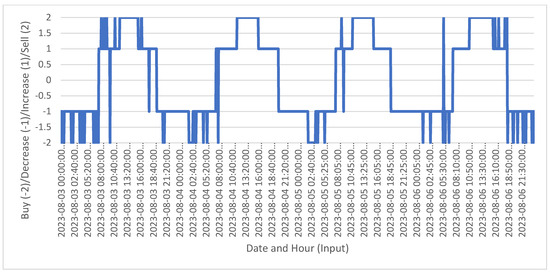 Figure 3 shows recommendations over a range of values from 3 August to 6 August 2023, labeled on the Y axis as Buy (−2)/Decrease (−1)/Increase (1)/Sell (2). An interpretation is provided: the Y axis extends beyond binary outcomes to include values of 2, 1, −1 and −2. The values 1 and −1 still correspond to “Increase” and “Decrease” load recommendations, while 2 and −2 correspond to stronger recommendations like “Buy” and “Sell”, respectively, whereas the X axis displays dates and times across the specified range, marked at 5-min intervals. Positive values (2 and 1) indicate varying degrees of bullish recommendations. A value of 2 (Sell) suggests a strong action, while a value of 1 (Increase) suggests a moderate action. Negative values (−1 and −2) indicate varying degrees of bearish recommendations. A value of −1 (Decrease) suggests a moderate action, while a value of −2 (Buy) suggests a strong action. The chart shows significant fluctuations between the values, suggesting rapidly changing conditions or responses to new data. There are periods where the recommendations stay constant for a series of intervals, indicating stable conditions or sustained decisions based on the underlying data. Some intervals show sharp transitions from strong to moderate recommendations or vice versa, which indicate volatile conditions or moments of significant change in metric or data the model is assessing. Sample data for the second scenario is provided in Table 5.