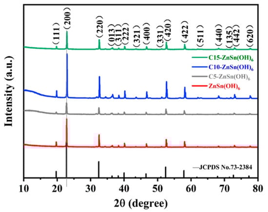 The XRD patterns of ZnSn(OH)6, C5-ZnSn(OH)6, C10-ZnSn(OH)6, and C15-ZnSn(OH)6 samples.