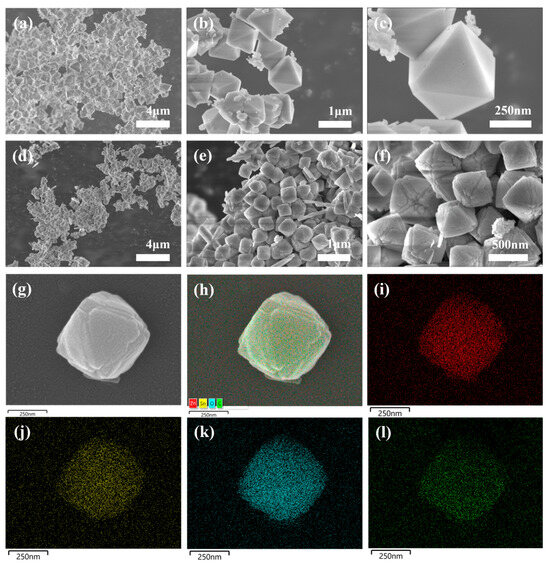 (a–c) SEM images of pure ZnSn(OH)6 samples at different magnifications; (d–g) SEM images of C10-ZnSn(OH)6 samples at different magnifications; and (h–l) mapping images of all elements, Zn, Sn, O, and C elements in C10-ZnSn(OH)6 samples, respectively.