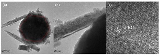 Figure 4 displays the TEM and HRTEM images of the C10-ZnSn(OH)6 samples, further confirming their octahedral morphology. The average side length of the octahedron is about 0.36 μm (Figure 4a). Additionally, one lattice plane of 0.26 nm is observed in HRTEM images, corresponding to (221) planes of the C10-ZnSn(OH)6, indicating an excellent crystallinity of the octahedron (Figure 4b,c). This analysis is consistent with the SEM and XRD results, further confirming the successful preparation of ZnSn(OH)6.