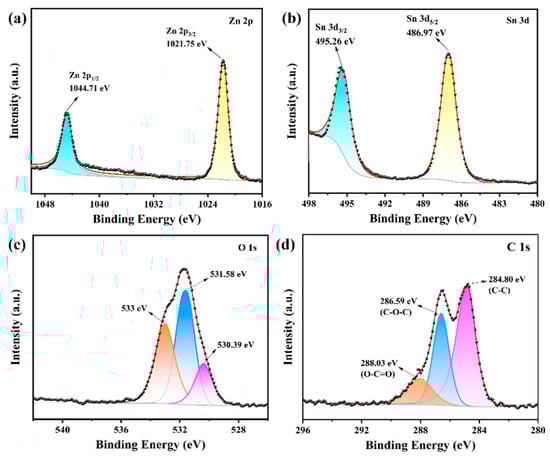 The XPS analysis of the C10-ZnSn(OH)6 sample is shown in Figure 5. The whole spectra illustrate that Zn, Sn, O, and C exist in this sample. In the Zn 2p spectrum, the peaks at 1044.71 eV and 1021.75 eV binding energies correspond to 2p1/2 and 3p3/2 for Zn2+, respectively (Figure 5a) [26]. Similarly, in the Sn 3d spectrum, the binding energy peaks at 495.26 eV and 486.97 eV originated from 3d3/2 and 3d5/2 for Sn4+, respectively (Figure 5b) [27]. Additionally, three peaks are obtained by fitting the O1s peaks, where the peaks at 530.39 eV, 531.58 eV, and 533 eV correspond to lattice oxygen, defective oxygen, and surface adsorbed oxygen in C10-ZnSn(OH)6, respectively (Figure 5c) [28,29,30]. In the spectrum of C 1s, the characteristic peaks at 284.80 eV, 286.59 eV, and 288.03 eV are from C-C, C-O-C, and O-C=O bonds, respectively (Figure 5d) [31]. The XPS results further demonstrate the presence of carbon in C10-ZnSn(OH)6.