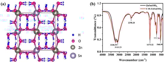 (a) The crystal structure of ZnSn(OH)6 sample and (b)FT-IR spectrum of C10-ZnSn(OH)6 and pure ZnSn(OH)6 samples.