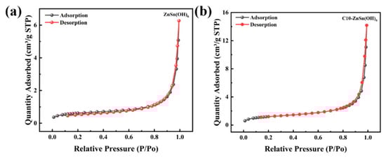 Nitrogen adsorption and desorption tests are conducted to further investigate the influence of carbon modification on ZnSn(OH)6 (Figure 7). The specific surface areas of pure ZnSn(OH)6 and C10-ZnSn(OH)6 are 2.14 m2/g and 4.24 m2/g, respectively. The C10-ZnSn(OH)6 exhibits a larger specific surface area. The higher specific surface area may provide more active sites on the material surface, which are beneficial to reactions and promote further response. Thus, it is inferred that the humidity-sensitive response of C10-ZnSn(OH)6 may be enhanced.