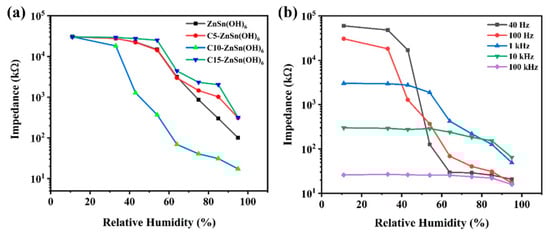 Figure 8a shows the impedance variation curves with ambient humidity for pure phase ZnSn(OH)6 and carbon/ZnSn(OH)6 sensors at 100 Hz and 1 V. The impedance response of the pure ZnSn(OH)6 sensor is two orders of magnitude in the humidity range of 11–95% RH. The impedance of the C10-ZnSn(OH)6 sensor decreases from 30,910 kΩ to 17.3 kΩ, realizing three orders of magnitude. The sensor response (SR) can be defined as SR = (Ra − Rg)/Rg × 100, where Ra represents the impedance at 11% RH and Rg represents the impedance at 95% RH [36]. Therefore, the response of ZnSn(OH)6, C5-ZnSn(OH)6, C10-ZnSn(OH)6, and C15-ZnSn(OH)6 sensors are calculated to be 30,595%, 9594%, 176,027%, and 9396%, respectively. Meanwhile, the C10-ZnSn(OH)6 sensor behaves with a good linearity. C5-ZnSn(OH)6 and C15-ZnSn(OH)6 sensors exhibit a relatively low response and poor linearity. Therefore, C10-ZnSn(OH)6 was an optimal choice for subsequent testing.