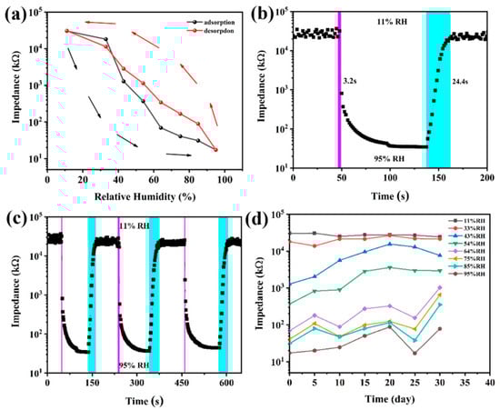 Figure 9a presents a humidity hysteresis graph of the C10-ZnSn(OH)6 sensor. The sensor was placed in 11%, 33%, 43%, 54%, 64%, 75%, 85%, and 95% RH humidity ambient, and the impedance was recorded. Then, the sensor was placed in high to low humidity environments, in order, to obtain the hysteresis properties of the sensor. The calculation method for hysteresis is as follows: γH = ±ΔHmax/2FFS, where ΔHmax represents the maximum difference in impedance at the same relative humidity, and FFS represents the full scale output [38]. The impedance is recorded when stable, showing a hysteresis of about 13.5%. Hydrophilic hydroxyl groups can form hydrogen bonds with water molecules. During the adsorption process, the formation of hydrogen bonds helps to enhance the conductivity of the material. During the desorption process, as water molecules dissociate, hydrogen bonds gradually disappear, leading to a decrease in the material’s conductivity and an increase in impedance. This leads to the inconsistent response speed of the C10-ZHS humidity sensor during adsorption and desorption processes when relative humidity environment changes, resulting in the moisture hysteresis phenomenon.