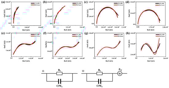 (a–h) CIS and equivalent circuit fitting curves of the C10-ZnSn(OH)6 humidity sensor under different relative humidity environments and (i,j) the corresponding equivalent circuits.