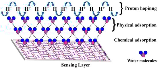 For the C10-ZnSn(OH)6 sample, the introduction of carbon mainly affects the surface state of ZnSn(OH)6; the surface of carbon modified samples appears rougher with a larger specific surface area, which is more conducive to the active sites on the surface to fully contact water molecules and enhance their adsorption capacity for water molecules. When the C10-ZnSn(OH)6 sensoris working, H+ and H3O+ are still the main carriers for conductivity. The sensing schematic diagram of the C10-ZnSn(OH)6 humidity sensor is shown in Figure 11. In low relative humidity environments, the sensing layer of C10-ZnSn(OH)6 mainly adsorbs water molecules through chemical adsorption. As the relative humidity increases, it gradually transforms into the physical adsorption of water molecules. In a high relative humidity environment, the Grotthuss chain reaction is formed, and protons skip to conduct.