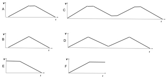 Illustrations of the effect of the six motion sequence values on the velocity profiles, shown in the six subfigures (A–F). The slope and maximum values of the profiles are determined by the kinematics variable. These profiles use the smooth variant.