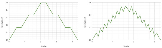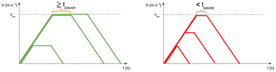 The increment variant requires acceleration phases to be split into increments such that the robot performs a constant velocity phase of duration ms when reaching certain velocities, which are multiples of . The first part of the constraint (Equation (9)) enforces that all acceleration or deceleration phases should end at one of the increment velocities. The second part of the constraint enforces that all acceleration and deceleration phases must be followed either by a pause phase or by their opposite phase (Equation (10)), i.e., an acceleration or deceleration phase cannot be extended, since it would violate the first constraint. The increment constraint is expressed by combining these two conditions in Equation (11).