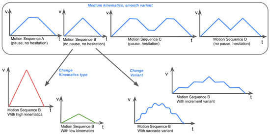 The corpus profiles were constructed by selecting the combination of values for three variables: the motion sequence, kinematics type, and variant. Figure 4 represents how each of these variables alters the shape of the corpus velocity profile.