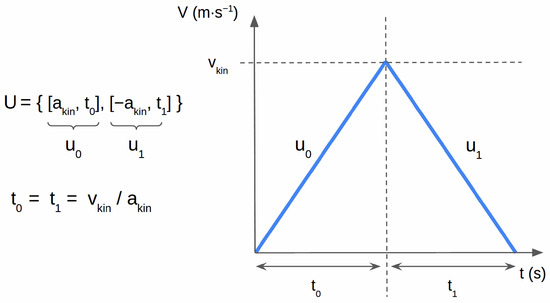 The kinematics type specifies a maximum velocity that the robot should not exceed, which we enforce with an inequality constraint . The kinematics type also captures the amount of energy used for a motion; hence, the velocity should approach when possible. For example, accelerating to , performing a constant velocity phase, and decelerating should not occur. The constraint in Equation (13) forces constant velocity phases to only be planned at the maximum velocity. The velocity and acceleration constraints are combined to form the overall kinematics constraint expressed in Equation (13).