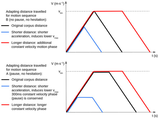 Since each combination of corpus variables uniquely defines the velocity profile, the distance travelled by the robot for a given type of movement prosody is fixed. For example, the profile using motion sequence B in Figure 5, using medium kinematics (, ), results in s, meaning the profile makes the robot cover a distance equal to m. In order to change the distance traveled, we need to introduce some degrees of freedom back into the velocity profile. In the following section, we discuss how we add flexibility while maintaining the distinct characteristics of each corpus variable as much as possible.