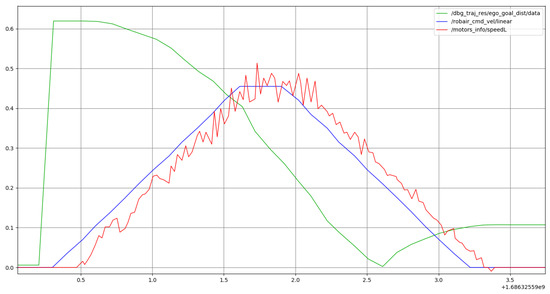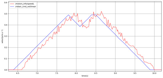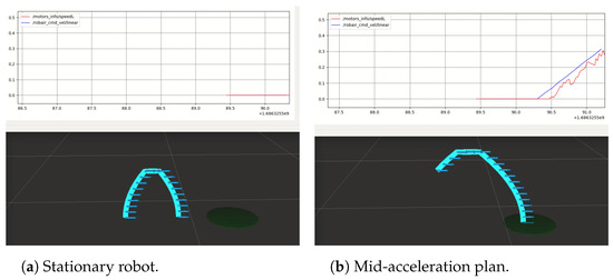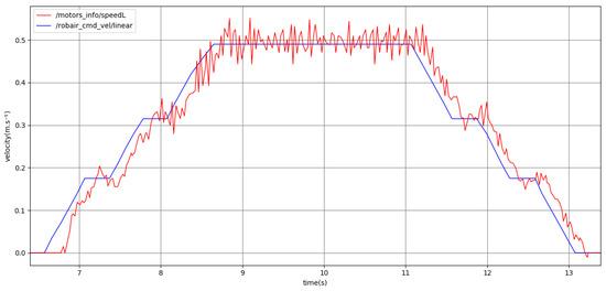 In this subsection, we demonstrate motions planned under the increment or saccade variant constraints. Figure 15 shows a long increment motion, allowing the robot to reach the maximum velocity for the medium kinematics type. The planner correctly inserts constant velocity phases at regular intervals, which are tracked by the robot motors, reproducing the stepped acceleration pattern.