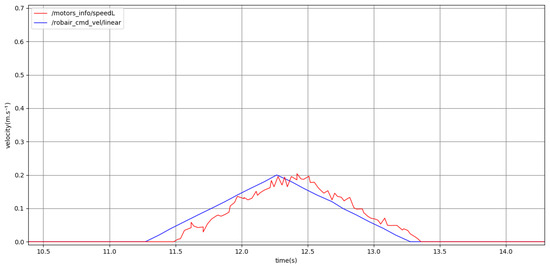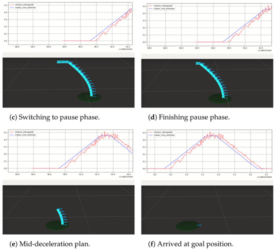 In Figure 5, we give an example of how a corpus velocity profile can be represented as a sequence of N motion phases, where . A motion phase consists of the slope of the velocity profile (acceleration) and a duration over which the acceleration is applied. In conjunction with an initial position along the robot’s forward axis, and initial linear velocity , these values define the robot’s trajectory in space and time, and are related through the forward kinematics Equation (2). This equation is simplified with respect to the full differential drive forward kinematics, since we do not control the angular velocity of the robot.