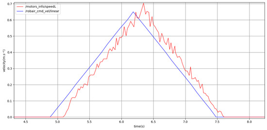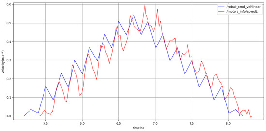 Point -to-point motion using the increment variant and medium kinematics. Past command velocities shown in blue and unfiltered odometry shown in red, both given in .