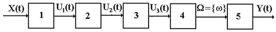 In this case, the vibration measurement system is regarded as a unified physical system converting the input signal X(t) (vibration) into the output one Y(t) (measured characteristics and parameters) and typically comprising some functional elements connected in series (Figure 1), where 1 is a vibration sensor (transducer) converting mechanical oscillations (vibration) X(t) into electrical signals U1(t); 2 is an input transducer harmonizing the sensor electrical signal U1(t) with downstream devices and performing various linear transformations (filtration, integration, differentiation); 3 is a linear amplifier, amplifying the input transducer’s electrical output signal U2(t) to the U3(t) magnitude required for further functional conversions and recording; 4 is a functional transducer receiving and calculating the required characteristics and parameters Ω = {ω}; 5 is a recorder displaying the measurement results Y(t).