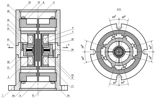 Figure 2 shows the structural features of such a vibration sensor version, where 1 and 2 are measuring windings with the number of turns w1 and w2, respectively; 3 and 4 are dielectric frames; 5 is a dielectric rod; 6 is a cylindrical ferrite sleeve; 7 is a cylindrical metal electrode; 8 and 9 are elastic suspensions in the form of flat membranes of equal resistance and section, made of beryllium bronze; 10 and 11 are dielectric shaped washers; 12 is a fastening screw; 13 and 14 are, respectively, upper and lower cylinders of the VS housing, made of magnetic material; 15 is an external tooth rim made of magnetic material; 16 and 17 are large washers made of magnetic material; 18 and 19 are small washers made of magnetic material; 20 is a ring made of non-magnetic metal material; 21 is an internal tooth rim made of magnetic material and serving as the inertial element; 22 is elastic elements in the form of flat beams of equal resistance and section, made of beryllium bronze; 23 and 24 are flanges made of non-magnetic metal material; 25 is a thin-walled dielectric sleeve.