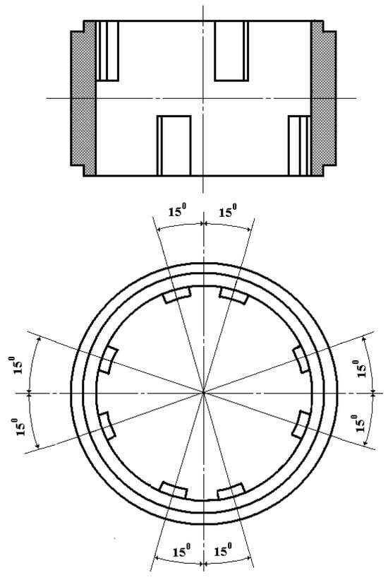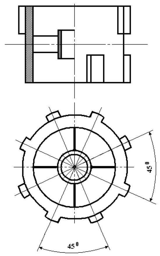 Internal and external tooth rims 21 and 15 are, respectively, the rotor and the stator. Internal tooth rim 21 functionally acts as the sensor’s second inertial mass, responding to angular accelerations and connected via four elastic elements 22 to ring 20, fixed through dielectric sleeve 25 on electrode 7 between small washers 18 and 19. Thereat, the lower and upper teeth of internal tooth rim 21 are positioned relative to each other with a spatial angular displacement of 45° (Figure 3) while the lower and upper teeth of external tooth rim 15 are paired relative to each other with a spatial angular displacement of 30° (Figure 4).