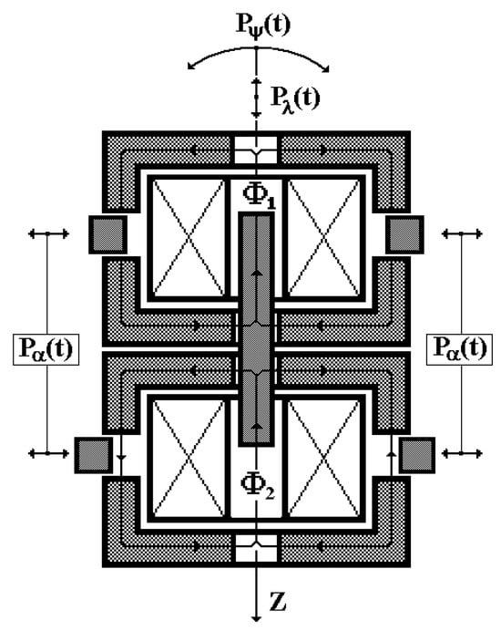 In fact, both MC1 and MC2 have their separate closed magnetic cores, resembling an armored ferrite core in shape, in each of which the excitation currents and of electrical windings MC1 and MC2 generate, respectively, spatially channeled magnetic fluxes Φ1 and Φ2 (Figure 6).