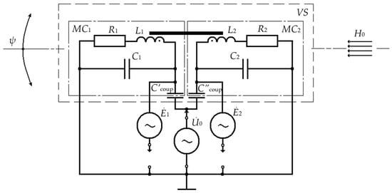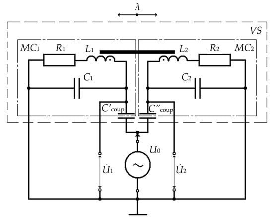 In Figure 7, ; w1 = w2 = w and l1k = l2k = lk are, respectively, the number of turns and the length of electrical windings of MC1 and MC2 (structural parameters); L1 and L2, R1 = R2 = R*, and C1 = C2 = C* are, respectively, inductances, active resistances, and stray capacitances of electrical windings of MC1 and MC2 (electrical parameters); , , and are, respectively, the power voltage of the half-bridge LC converters from the harmonic signal generator and electrical voltages from the outputs of the first and second LC converters.