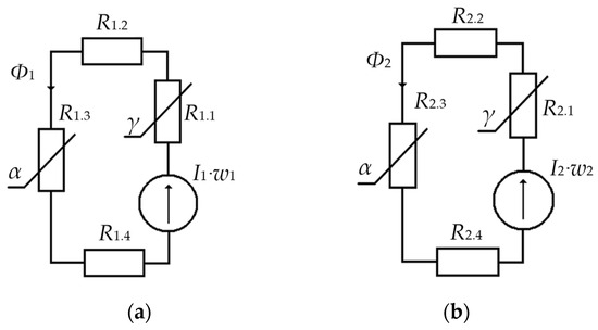 To do this, we will consider versions of equivalent circuits of the magnetic cores of MC1 and MC2, formed by a closed magnetic circuit of corresponding sections with lumped parameters (Figure 8), where R1.1 and R2.1 are, respectively, the total magnetic resistances of the central sections of the magnetic cores of MC1 and MC2; R1.2 and R2.2 are, respectively, the total magnetic resistances of the upper sections of the magnetic cores of MC1 and MC2; R1.3 and R2.3 are, respectively, the total magnetic resistances of the side sections of the magnetic cores of MC1 and MC2; R1.4 and R2.4 are, respectively, the total magnetic resistances of the lower sections of the magnetic cores of MC1 and MC2; and are, respectively, magnetomotive forces in the closed magnetic cores of MC1 and MC2, created by currents in MC1 and MC2; and are, respectively, the magnetic fluxes in the magnetic cores of MC1 and MC2.