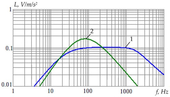Also, in the vibration sensor experimental studies, its amplitude-frequency response (AFR) was obtained for two operating modes (see Figure 15): 1—mode of recording torsional oscillations of the tooth rim sensitive element relative to the suspension point; 2—mode of recording linear oscillations of the rod-shaped sensitive element.