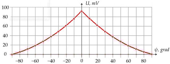 In this case, when varying the vibration sensor inclination angle ψ, corresponding changes in its original output signal were observed. Figure 16 shows the results of this part of the experiment.