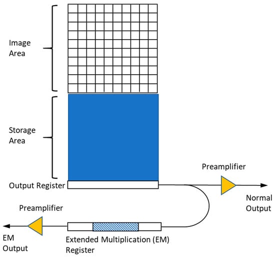 Schematic of EMCCD. It consists of a CCD with an additional electron-multiplying (EM) register located between the end of the normal serial register and the output amplifier.