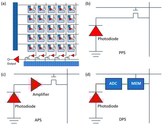 Like CCDs, the CMOS sensors are semiconductor image sensors that can convert photons into electrons. CMOS sensors contain rows of photodiodes coupled with individual amplifiers to amplify the electrical signal from the photodiodes [29,38], as shown in Figure 3a. CMOS image sensors can be classified into two different forms based on their pixel architecture, which are the analog pixel sensor and the digital pixel sensor (DPS). There are two sub-types for analog pixel sensors, the passive pixel sensor (PPS) and the active pixel sensor (APS) [28]. The PPS design, as shown in Figure 3b, includes a photodiode and a single row-select transistor. The APS general design, as shown in Figure 3c, consists of 3–4 transistors and a photodiode. APS image sensors are often more popular compared to PPS image sensors. A DPS architecture is a more recent design for CMOS technology. A DPS image sensor consist of a photodetector, an ADC, and a digital memory used for temporary storage of data before the digital readout, as shown in Figure 3d. Some of the advantages that come with using a DPS image sensor include the high-speed readout, and the improved scaling with CMOS technology due to the reduced analog circuit performance demands. The main disadvantage that makes the DPS less popular than the APS is that it requires the use of more transistors per pixel compared to other image sensors, which leads to larger pixel sizes and a lower fill factor.