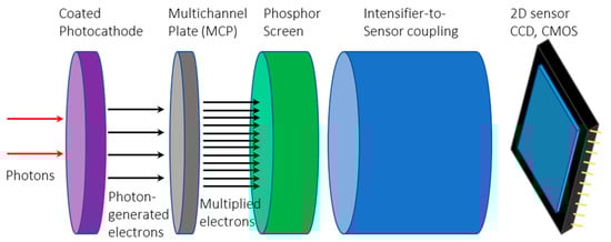 Compared to EMCCDs, GaAs-based intensified CCDs (ICCDs) and CMOSs (ICMOSs) have a different multiplication mechanism, in which an image intensifier amplifies the collected image before it is registered by the CCD or CMOS. This mechanism of the image intensifier functions by multiplying the number of incoming photons, which amplifies the incoming light signal, allowing the ICCD and ICMOS cameras to take images in extremely low-light conditions and with extremely short exposure times. The image intensifier was made of three main components, a photocathode, a multichannel plate (MCP), and a phosphor screen, as shown in Figure 4. The low level of incoming light is first converted into electrons at the photocathode, which are then accelerated and amplified at the MCP and, finally, the amplified signal is converted back into a visible green light signal at the phosphor screen ready for the CCD or CMOS acquisition [46]. The generation III intensifiers have greater sensitivity, higher-gain MCPs, and better image quality compared to previous generations [47]. In addition, a thin film of sintered aluminum oxide is attached to the MCP to protect the photocathode from spurious backscattered ions.