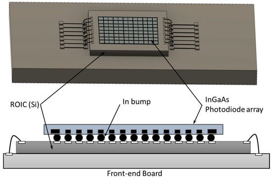 Due to the smaller bandgap of InGaAs, the InGaAs-based cameras have excellent sensitivity in the SWIR region [52,53]. An InGaAs focal plane array is a two-dimensional array containing thousands or even several millions of photodiodes, which comprise an indium phosphide (InP) substrate, an InGaAs absorption layer, and an ultrathin InP cap that has been indium bump-bonded to a readout integrated circuit (ROIC). A diagram of this is shown in Figure 5. When the SWIR incident photons interact with the InGaAs two-dimensional array, the charges are generated and then converted into voltage under the control clock on the ROIC. Finally, the signal is used to create an image on the off-chip electronics. However, the smaller bandgap of the InGaAs materials produces a higher dark current, requiring the InGaAs cameras to be cooled deeply to reduce the noise level.