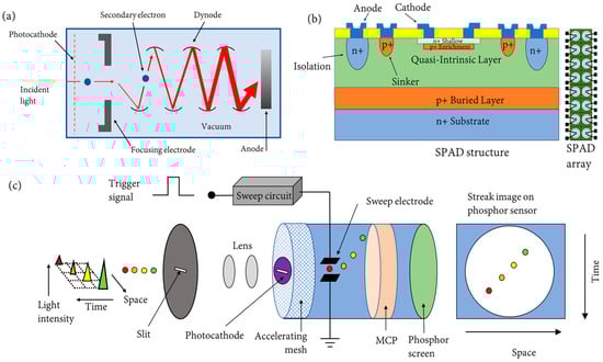 Streak cameras operate differently compared to other FLIM sensors, and they are considered the fastest sensors available. Streak cameras can typically be divided into either simple or complex streak cameras depending on how they operate [74]. The simplest streak camera uses some form or method to deflect an incident light beam, such as a rotating mirror. While the design is simple, it is also limited in terms of temporal resolution because the speed of the device is limited. A complex streak camera is typically made within a vacuum tube, as shown in Figure 7c, and is designed to convert fast time intervals into differences in geometry. It operates when light hits the photocathode within the vacuum tube, which generates a number of electrons proportional to the intensity of the light. Electrons emitted by the cathode are accelerated by a high voltage that forms a pulsed electron beam. The electron beam is deflected by a pair of electrodes, then hits a phosphor screen to generate a visible streak image, which can be recorded by a CCD camera.