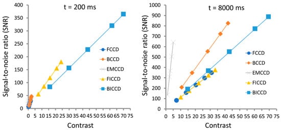 Plots of signal-to-noise vs contrast of different CCD cameras under the integration times of 200 ms and 8000 ms, respectively. Adapted from Zhu et al. [19].