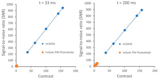 Plots of signal-to-noise vs contrast of IsCMOS camera and InGaAs PIN Photodiode under integration times of 33 ms and 200 ms, respectively. Adapted from Zhu et al. [23].