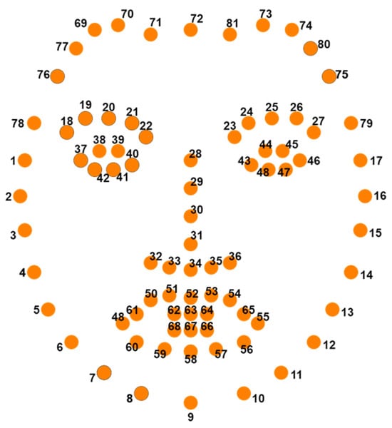 It is expected that the faces in a dataset will be focused on, and computer training datasets can locate facial landmarks through facial alignment and angle. There are primarily 68 (x, y) coordinates for facial landmarks; these map facial points distributed across the chin (1–17), right eyebrow (18–22), left eyebrow (23–27), nose (28–36), right eye (37–42), left eye (43–48), and mouth (49–68). This paper introduces an additional 13 points on the forehead (69–81) to improve accuracy in the facial recognition, as shown in Figure 1.
