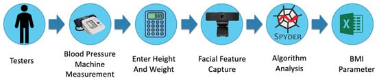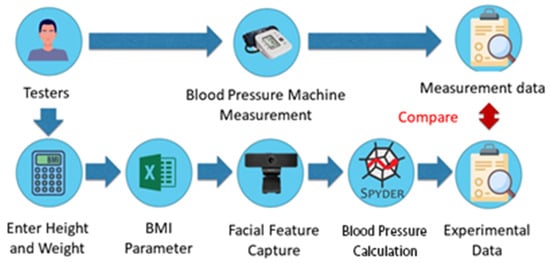 The system architecture of this research is illustrated in Figure 6. Initially, the test subjects input their height and weight into the computer to calculate their BMI values. Next, the corresponding blood pressure formula parameters for the BMI intervals were imported from an Excel spreadsheet. Subsequently, a webcam was used for face detection, and the pulse wave reflected from the forehead was captured within the region of interest. The blood pressure values were then calculated based on the extracted light wave. Additionally, blood pressure measurements were simultaneously taken using a blood pressure monitor to validate the accuracy of the calculated values.