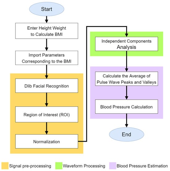 The non-contact blood pressure measurement process in this study is illustrated in Figure 7. The system primarily comprised the following five steps: