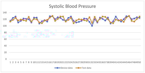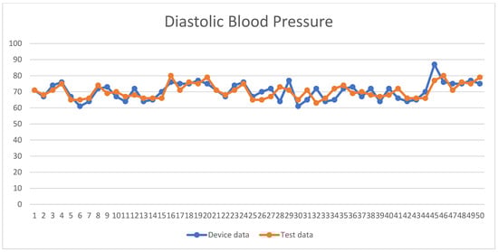 A total of 50 people were tested in this study, and the male-to-female ratio was approximately 2:1; the overall test results were not proportional to the male-to-female ratio, and the blood pressure values measured by the system were compared with those measured by a blood pressure monitor. The experimental and instrument-measured values, SBP and DBP, were recorded, as shown in Figure 9 and Figure 10, respectively. The X-axis represents the number of test subjects, and the Y-axis represents blood pressure values. The MAPE for the SBP in this study was 3.72%, the RMSE was 4.73 mmHg, the MAE was 4.67 mmHg, the STD was 3.04 mmHg, and the R2 was 0.50; for DBP, the MAPE was 3.9%, the RMSE was 3.12 mmHg, the MAE was 3.84 mmHg, the STD was 2.91 mmHg, and the R2 was 0.65, as shown in Table 4.