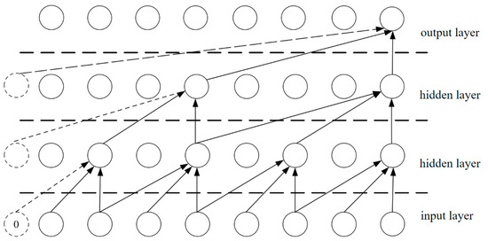 There are four layers in the figure above. The first layer is the output layer, the second layer is the hidden layer, the third layer is the hidden layer, and the fourth layer is the input layer.The dotted lines and “0” in the diagram indicate zero-padding at the beginning of the sequence, enabling convolutional operations on the nodes at the beginning of the sequence.