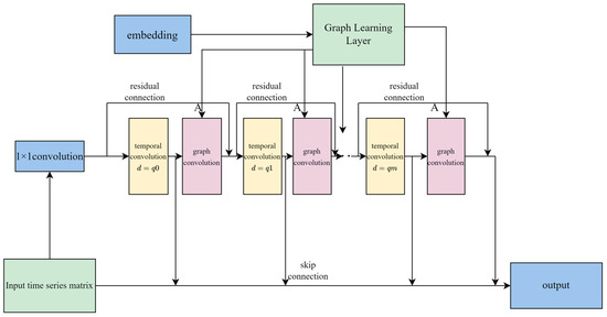 As shown in Figure 2, first, 1 × 1 convolution projects the input into the hidden space. Second, temporal and graph convolution modules interleave to capture temporal and spatial dependence, respectively. The hyperparameter controlling the size of the receptive field of a temporal convolutional module, the inflation factor d, increases at an exponential rate of q. The inflation factor determines the distance between the neighboring elements in the convolution kernel. If the inflation factor is set to 1, the expansion convolution is equivalent to an ordinary convolution operation. However, if the inflation factor is set to an integer value greater than 1, the interval between the elements in the convolution kernel will increase accordingly so that the convolution operation can skip a certain number of input data points for calculation, thus expanding the receptive field of the convolution kernel on the input data. The graph learning layer is used to learn the hidden graph adjacency matrix of the graph convolutional modules. Resiresidual and hopping connections were added to the model to avoid the problem of a vanishing gradient. The DCGNN model graph is shown in Figure 2, where m is the number of graph convolutional modules and temporal convolution modules.