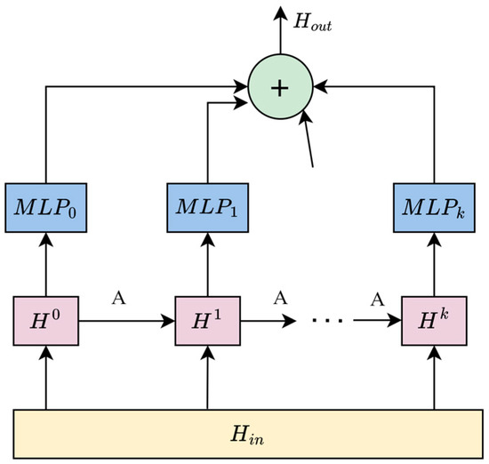 The MixHop layer contains the information propagation and selection steps. It first propagates the information horizontally and then selects it vertically. The MLP represents a multi-layer perceptron. A structure diagram of the MixHop layer is shown in Figure 4.