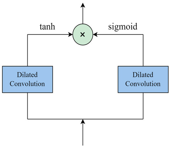 Figure 5 shows the structural diagram of the dilated convolution layer. The temporal convolution model uses a one-dimensional dilated convolution filter to extract the temporal features. The temporal convolution model consists of two dilated convolution layers; one of the dilated convolution layers is followed by a tanh activation function that acts as a filter; the other dilated convolution layer is followed by an s-type activation function as a gate to control the filter and transfer the information to the next module.