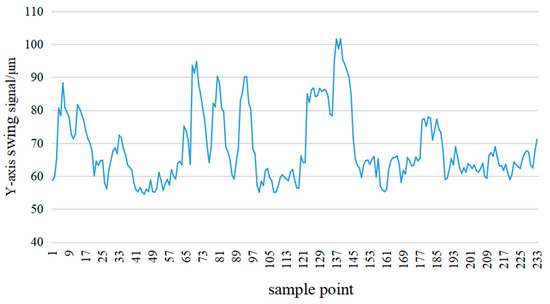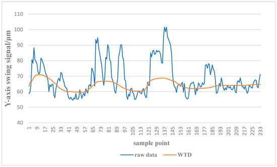 Based on the experimental analysis presented above, Db 10 was selected as the optimal wavelet base of the WTD algorithm, and the number of decomposition layers was determined as five. Figure 10 shows the raw data of the Y-axis swing signal and the data after the WTD algorithm. The denoised data are smoother than the original data and preserve the running trend of the signal well. When the features are selected, the state variables associated with the Y-axis swing signal of the guide bearing can be excavated more accurately.