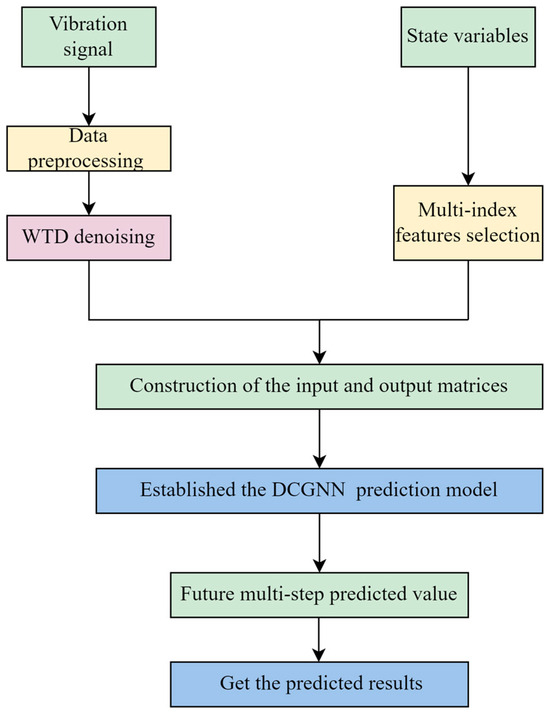 Research on the prediction of the swing trend of main guide bearings based on MFS-DCGNN includes two parts: model establishment and model prediction. The flow chart of the MFS-DCGNN prediction model is shown in Figure 7.