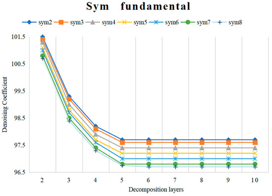 Denoising coefficient of Sym wavelet bases under different decomposition layers.
