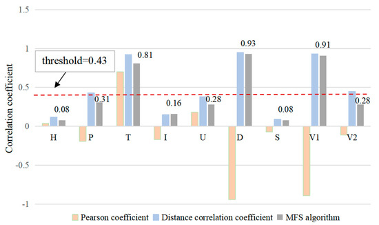 The linear correlation methods of feature selection include the following: the mutual information method [13], the maximum information coefficient method [14], the Spearman correlation coefficient method [15], and the Pearson correlation coefficient method [16,17], etc.