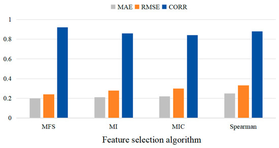 Figure 12 shows the comparative results of the MAE, RMSE, and CORR values of the four different feature selection algorithms. It can be seen that compared with the MI, MIC, and Spearman algorithms, the MAE of the MFS algorithm is decreased by 9.52%, 13.63%, and 20.83%, respectively; the RMSE is decreased by 6.89%, 12.90%, and 15.62%, respectively; and the CORR values are increased by 5.74%, 8.23%, and 10.84%, respectively.