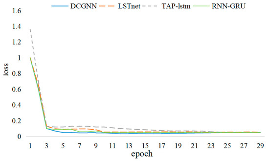 Loss values of DCGNN, LSTNet, TPA-LSTM, and RNN-GRU algorithms.