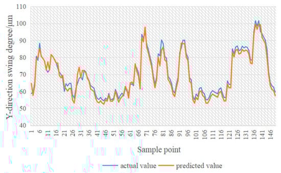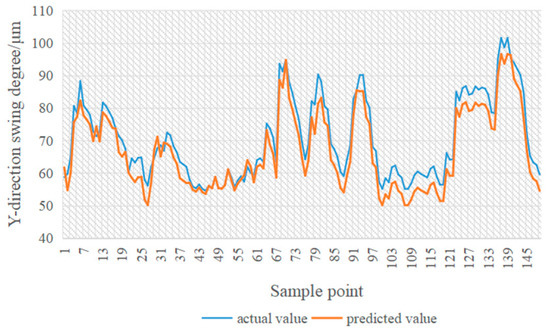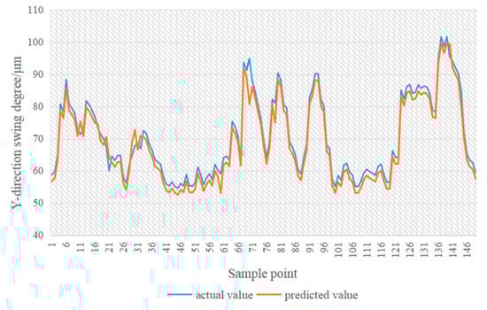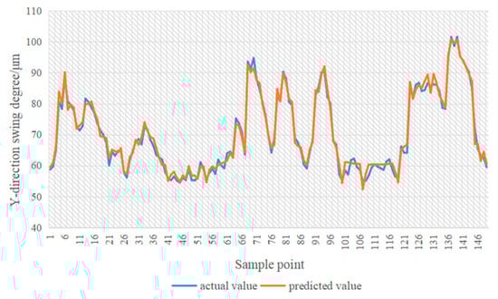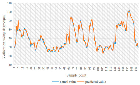 Figure 11 shows the comparative results of the correlation coefficients from three algorithms (the Pearson correlation coefficient, distance correlation coefficient, and MFS algorithms) for nine state variables. Figure 9 shows that the mean correlation coefficient calculated by the MFS algorithm is 0.43. Therefore, 0.43 is set as the correlation threshold of the MFS algorithm. Among the coefficients, the MFS algorithm correlation coefficients of the upper guide bearing oil groove (T), axial displacement (D), and pressure pulsation at the inlet of the guide vane and runner (V1) are 0.81, 0.93, and 0.91, respectively; these values are greater than the correlation threshold of 0.43 and show a high correlation with the Y-axis swing signal. Therefore, the state variables of the upper guide bearing oil groove (T), axial displacement (D), and pressure pulsation at the inlet of the guide vane and runner (V1) are selected as the input of the prediction algorithm.
