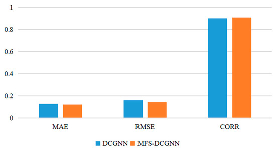 According to Figure 18 and Figure 19, the MAE of the MFS-DCGNN algorithm is decreased by 7.70%; the RMSE is decreased by 11.88%; and the CORR value is increased by 0.69% compared with the DCGNN algorithm.